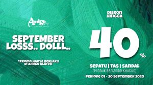 Bulan September iki akan menjadi bulan palingg ceria untuk masyarakat Klaten dan sekitarnya, karena e karena….. Amigo Klaten mengadakan promo SEPTEMBER LOSSS.. DOLLL.. dengan diskon hingga 40 % untuk produk sepatu,tas dan sandal (produk bertanda khusus). Mulai 1 – 30 September 2020 yawww….